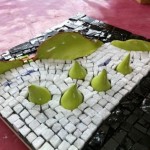 Pose des tesselles en céramique et des tesselles taillées à la marteline en suivant la maquette